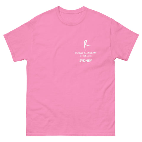 The 100% cotton unisex classic tee printed in white with the R Royal Academy of Dance Sydney will help you land a more structured look. It sits nicely, maintains sharp lines around the edges, and goes perfectly with layered streetwear outfits.