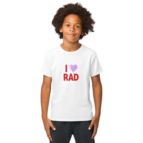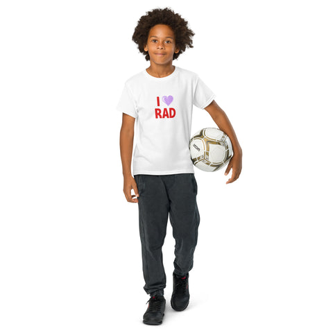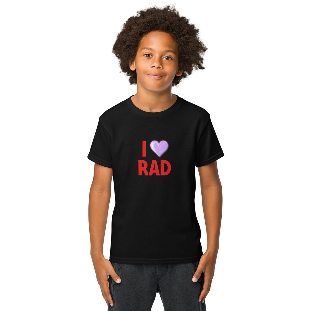 A comfy tee shirt with the I love RAD slogan on the front chest in red with a Pink Heart for Kids.